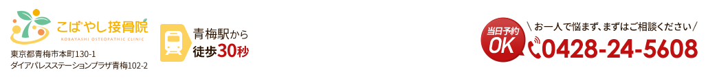 当院では効果的な施術だけでなく、患者様へのカウンセリングやボディケアの指導にも力を入れています。普通の肩こりなどとは違い、ぎっくり腰の痛みは仕事や家事に影響するばかりか、きちんと改善しなければまた繰り返すのではないかという不安が残り、趣味や家族との時間も楽しめなくなってしまいます。そんな患者様の悩みや不安にお応えできるのが当院の自慢です。ぎっくり腰に関する不安や続いている痛みがあれば青梅のこばやし接骨院までお気軽にご相談ください。